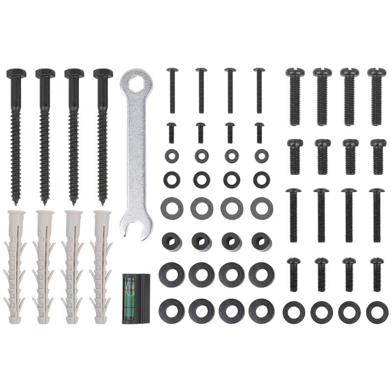 Es werden Schrauben und Dübel für die Montage an Betonwänden mitgeliefert und auch ein Satz mit unterschiedlichen Schraubengrößen für die Montage der Streben an den 4 vorgesehenen Gewinden an Ihrem Fernsher liegt bei.